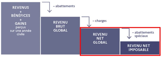 - Si M. et Mme Dupond ont des revenus nets globaux de 17 000 €, leur revenu net imposable sera de 17 000 – 2 822 = 14 178 €. Ils ne paieront des impôts que sur la somme de 14 178 €.